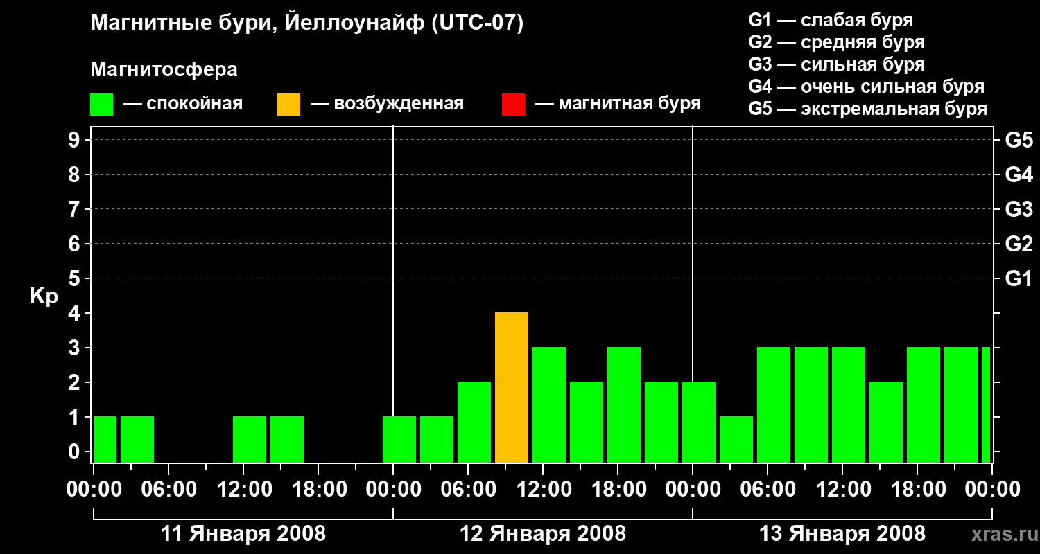 Изменения геомагнитного индекса Kp с 11 по 13 января 2008 года для средних широт