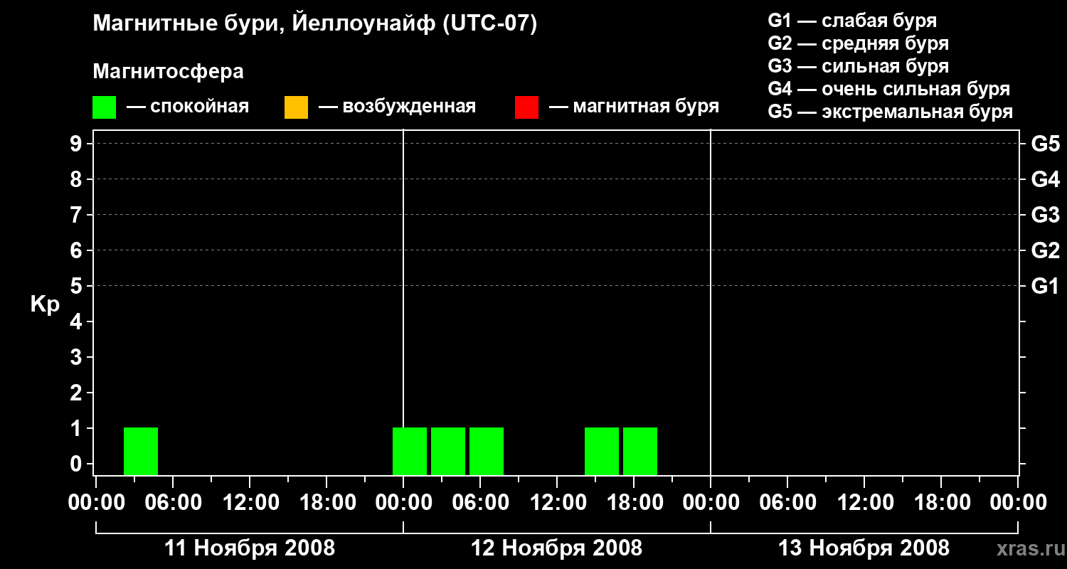 Изменения геомагнитного индекса Kp с 11 по 13 ноября 2008 года для средних широт