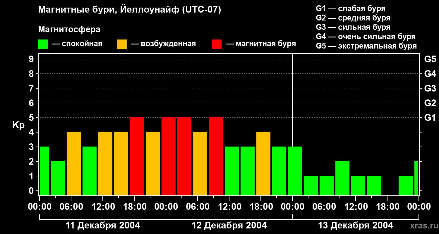 Изменения геомагнитного индекса Kp с 11 по 13 декабря 2004 года для средних широт
