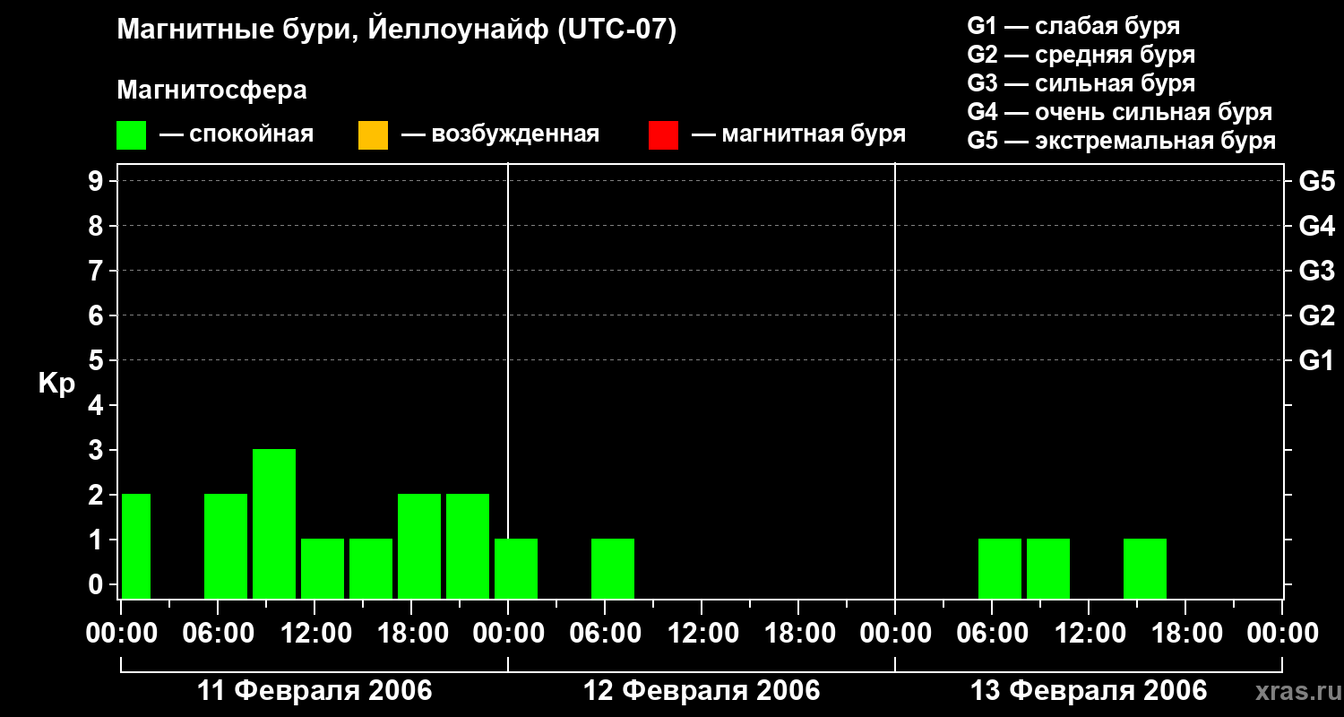 Изменения геомагнитного индекса Kp с 11 по 13 февраля 2006 года для средних широт