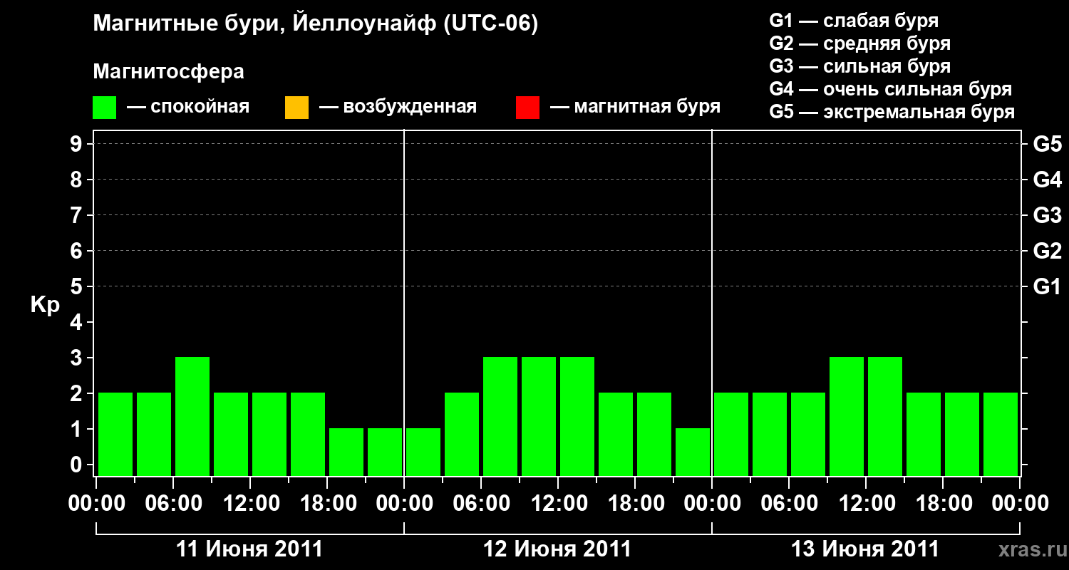 Изменения геомагнитного индекса Kp с 11 по 13 июня 2011 года для средних широт