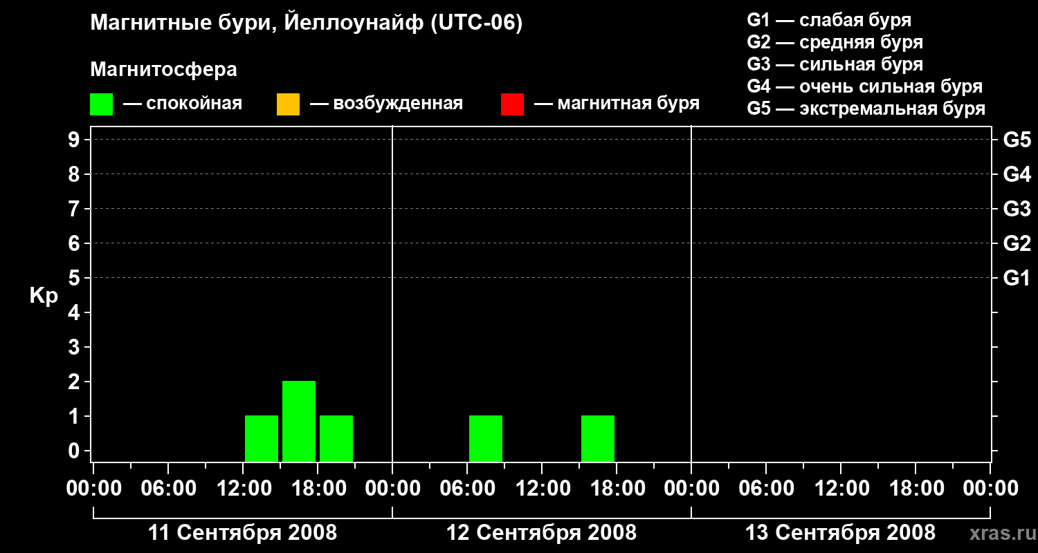 Изменения геомагнитного индекса Kp с 11 по 13 сентября 2008 года для средних широт