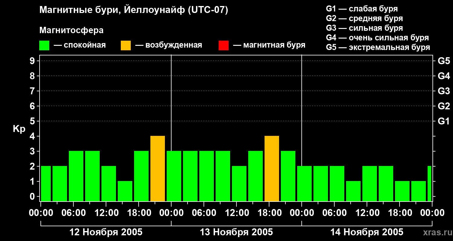 Изменения геомагнитного индекса Kp с 12 по 14 ноября 2005 года для средних широт