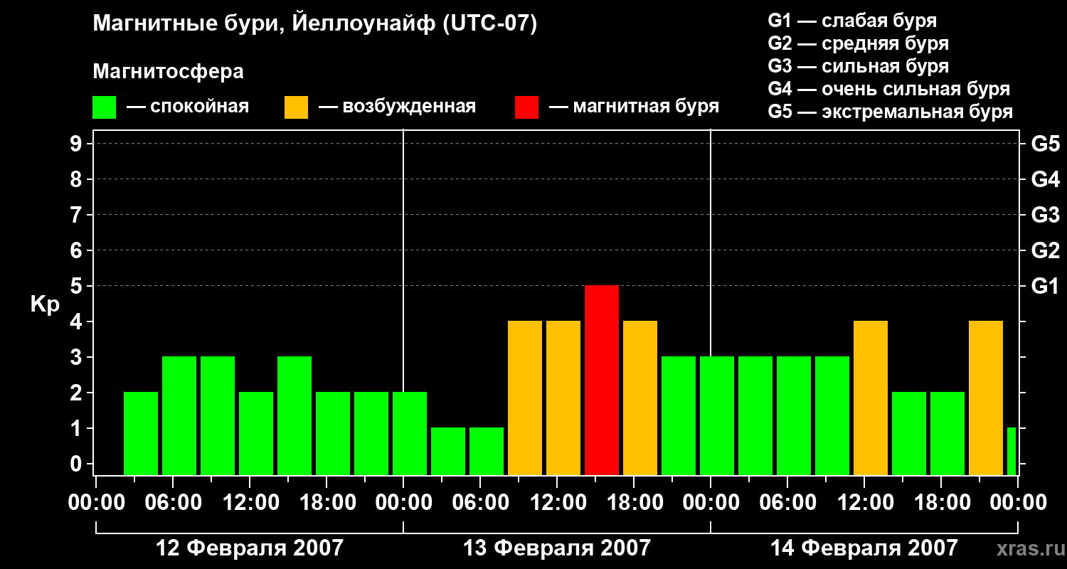 Изменения геомагнитного индекса Kp с 12 по 14 февраля 2007 года для средних широт