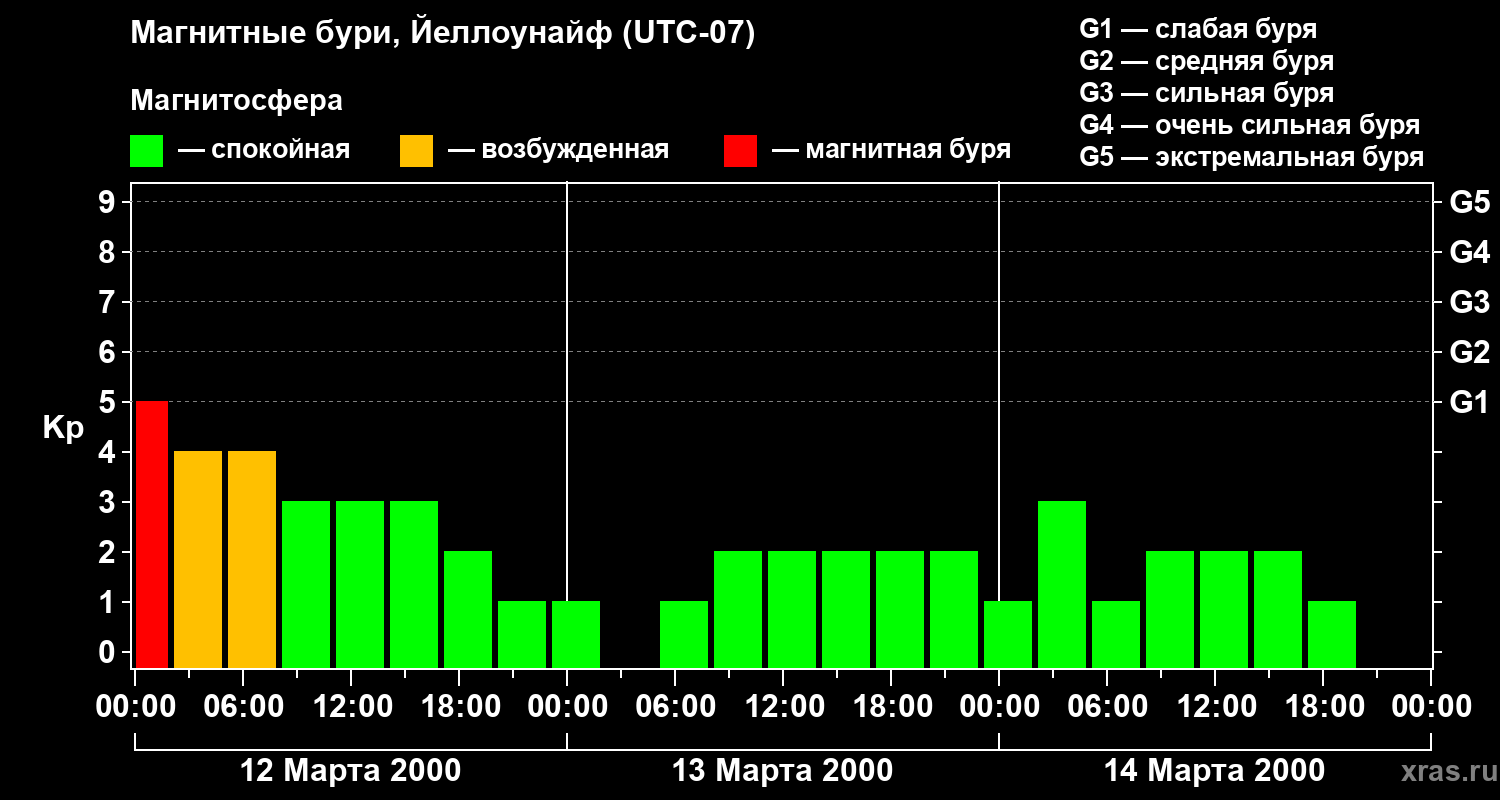 Изменения геомагнитного индекса Kp с 12 по 14 марта 2000 года для средних широт