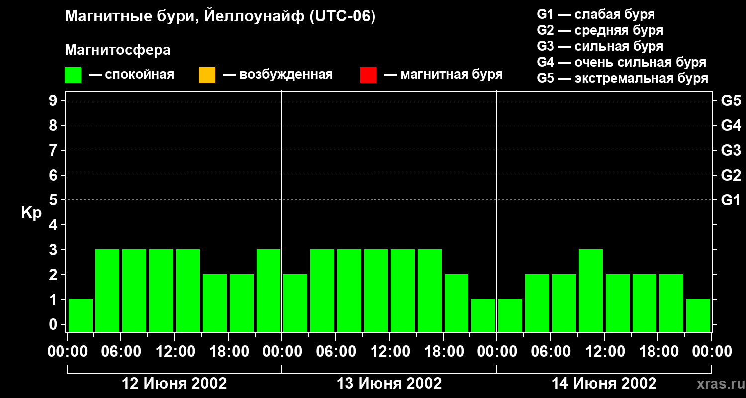Изменения геомагнитного индекса Kp с 12 по 14 июня 2002 года для средних широт
