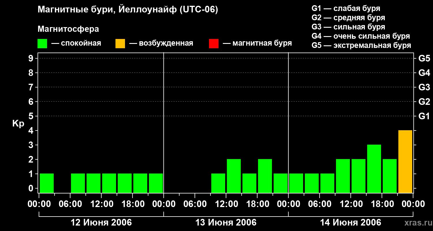 Изменения геомагнитного индекса Kp с 12 по 14 июня 2006 года для средних широт