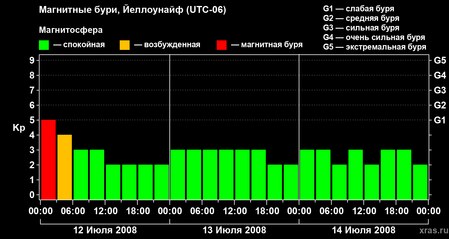 Изменения геомагнитного индекса Kp с 12 по 14 июля 2008 года для средних широт