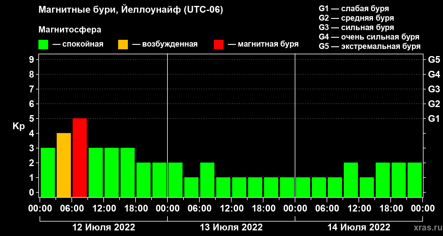 Изменения геомагнитного индекса Kp с 12 по 14 июля 2022 года для средних широт