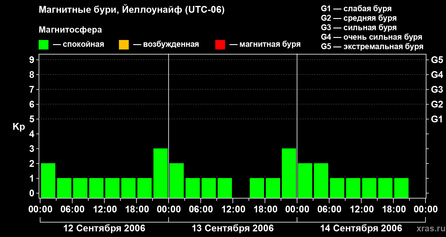 Изменения геомагнитного индекса Kp с 12 по 14 сентября 2006 года для средних широт