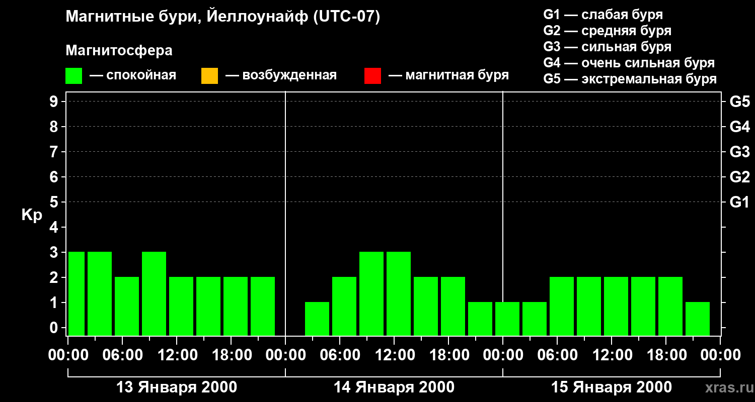 Изменения геомагнитного индекса Kp с 13 по 15 января 2000 года для средних широт