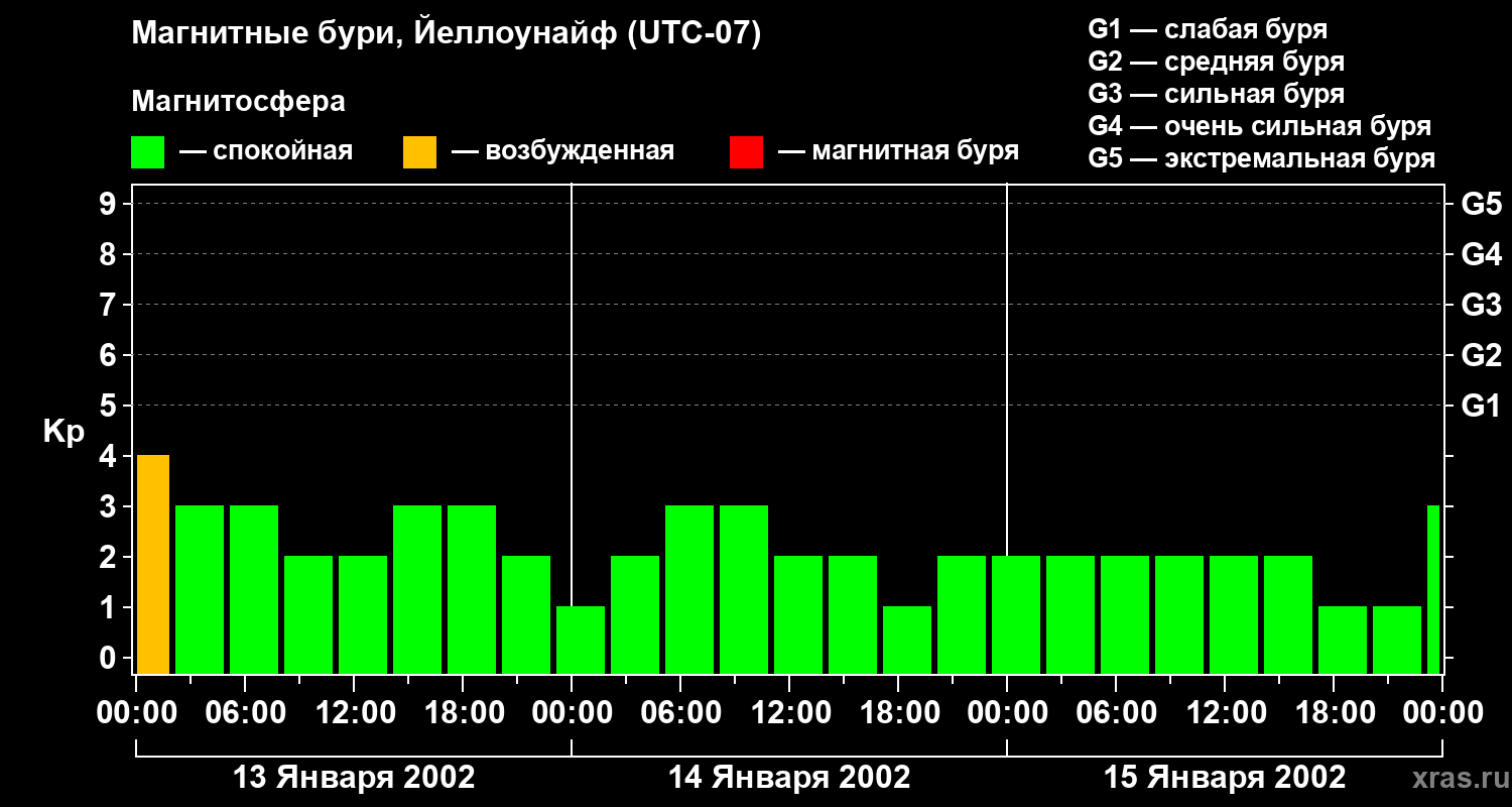 Изменения геомагнитного индекса Kp с 13 по 15 января 2002 года для средних широт