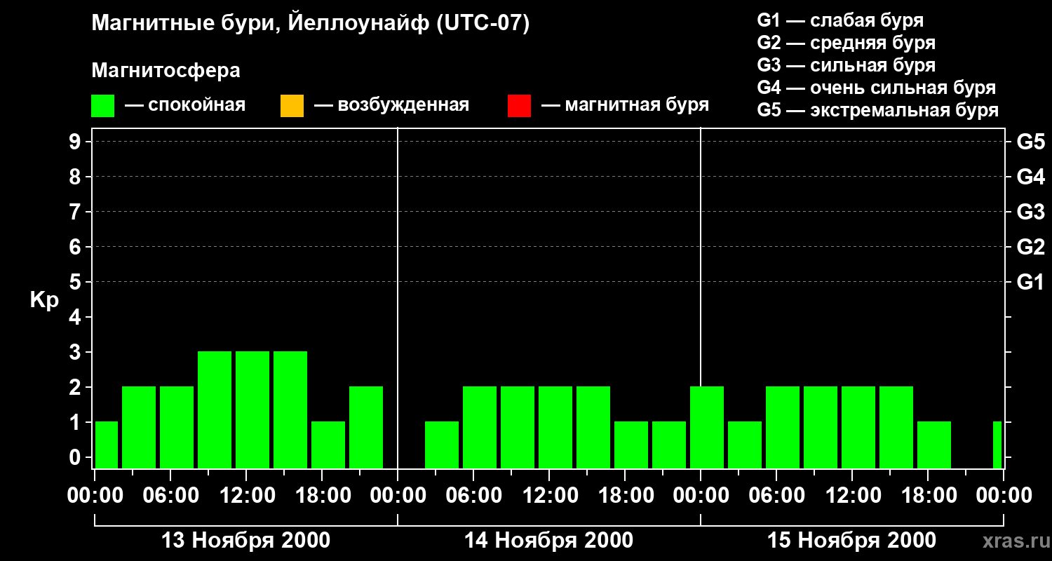 Изменения геомагнитного индекса Kp с 13 по 15 ноября 2000 года для средних широт