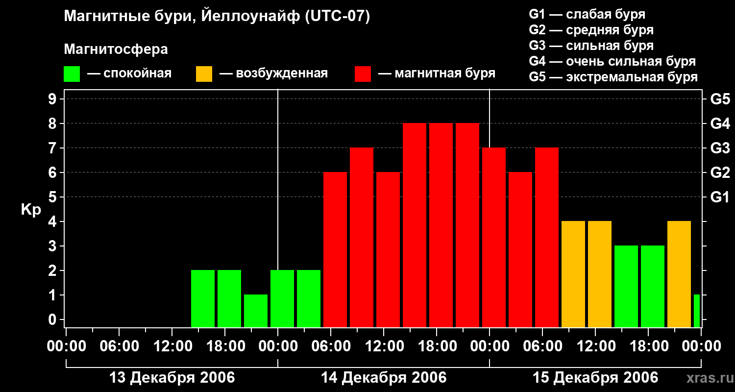 Изменения геомагнитного индекса Kp с 13 по 15 декабря 2006 года для средних широт