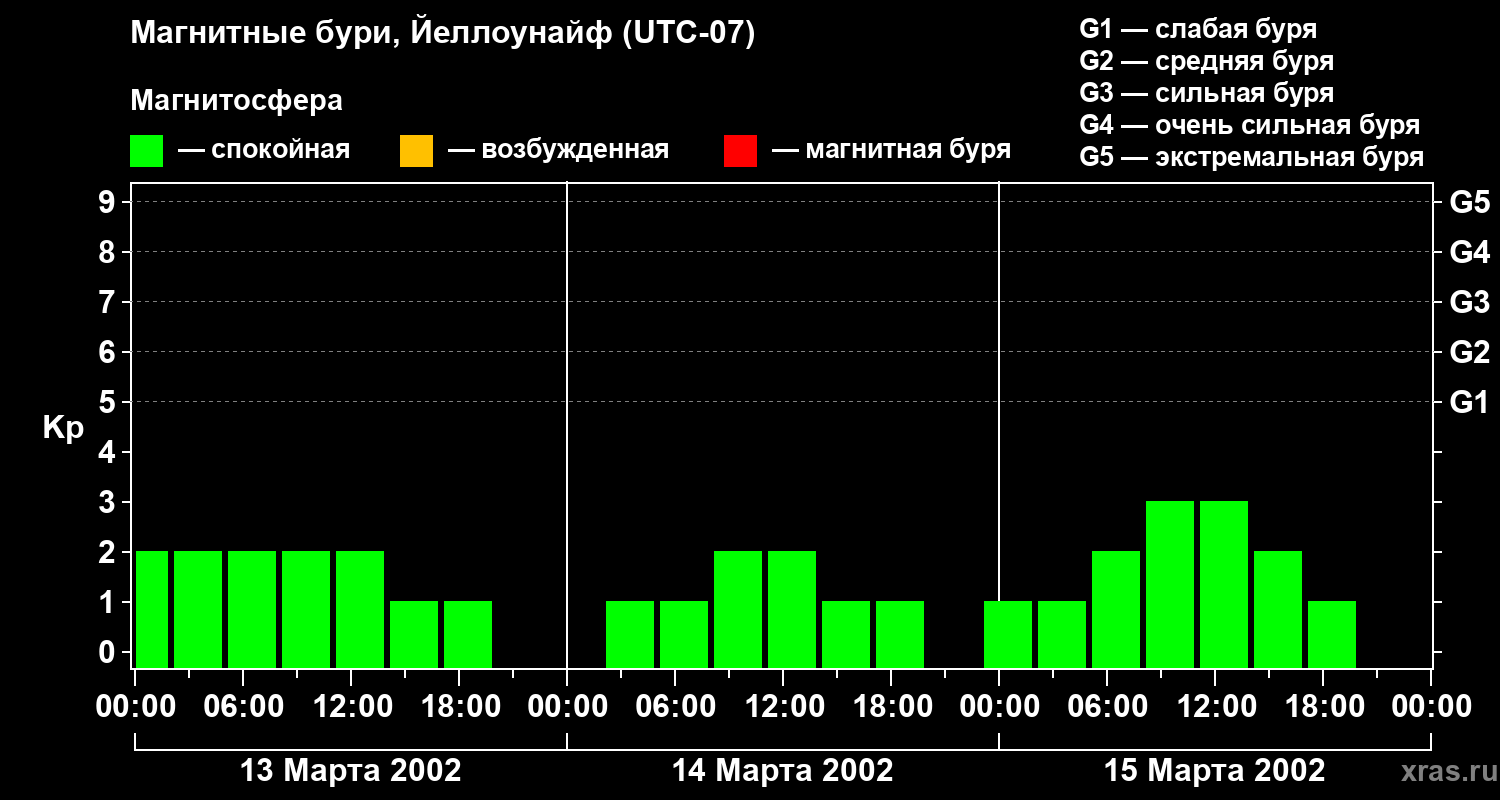 Изменения геомагнитного индекса Kp с 13 по 15 марта 2002 года для средних широт