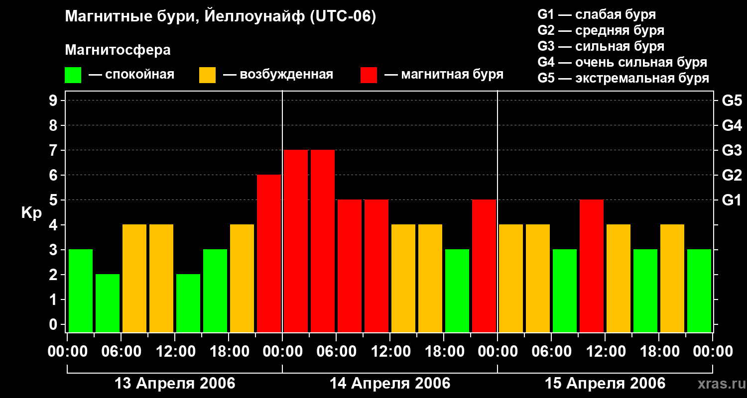 Изменения геомагнитного индекса Kp с 13 по 15 апреля 2006 года для средних широт