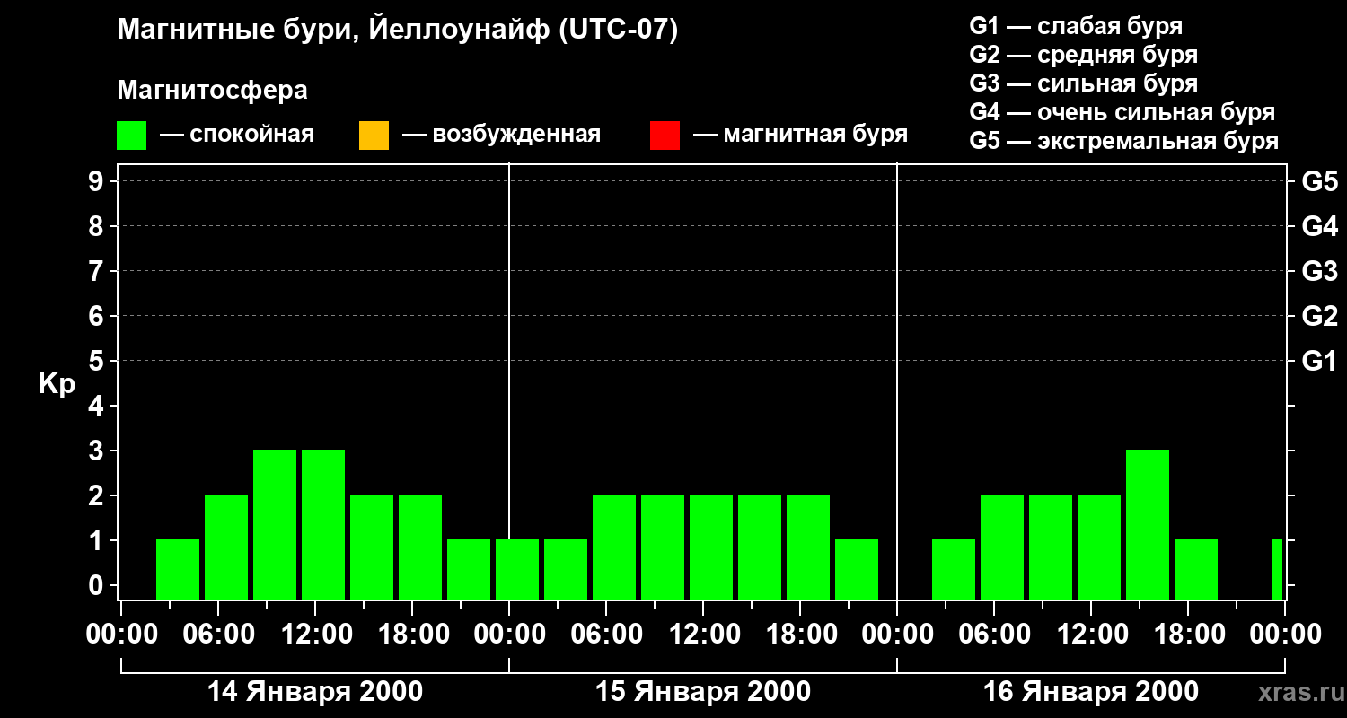 Изменения геомагнитного индекса Kp с 14 по 16 января 2000 года для средних широт