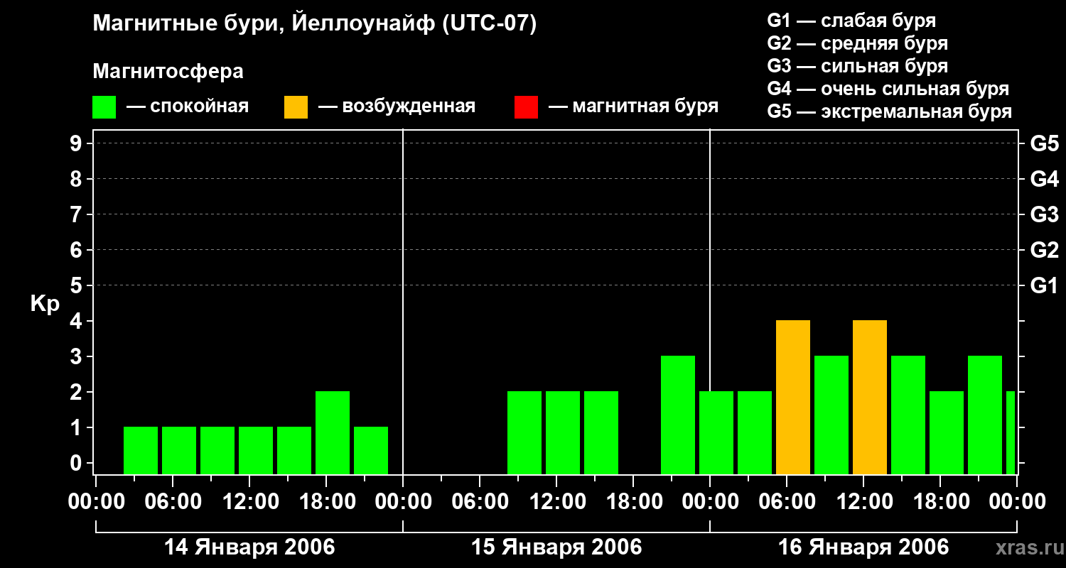 Изменения геомагнитного индекса Kp с 14 по 16 января 2006 года для средних широт