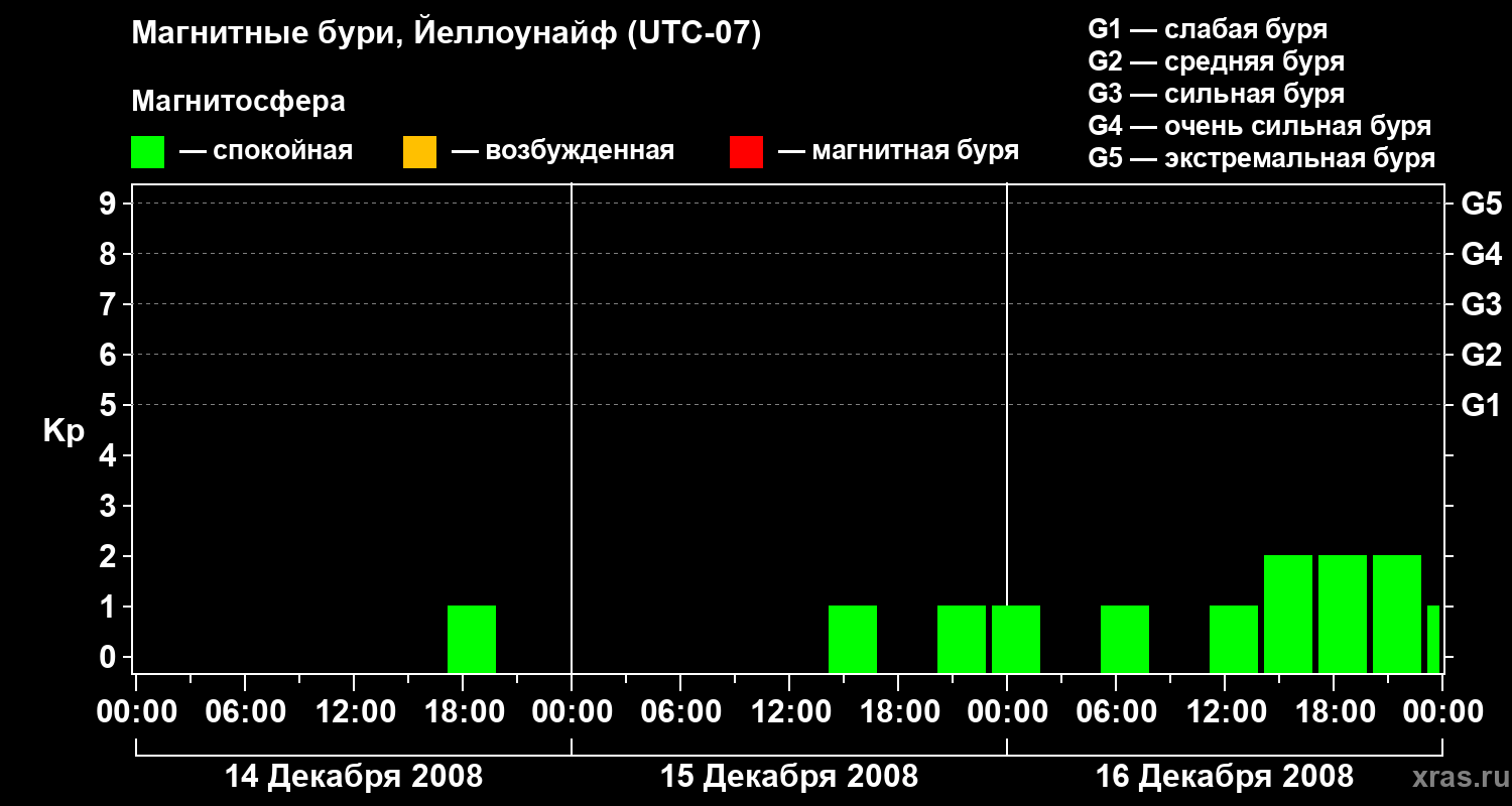Изменения геомагнитного индекса Kp с 14 по 16 декабря 2008 года для средних широт