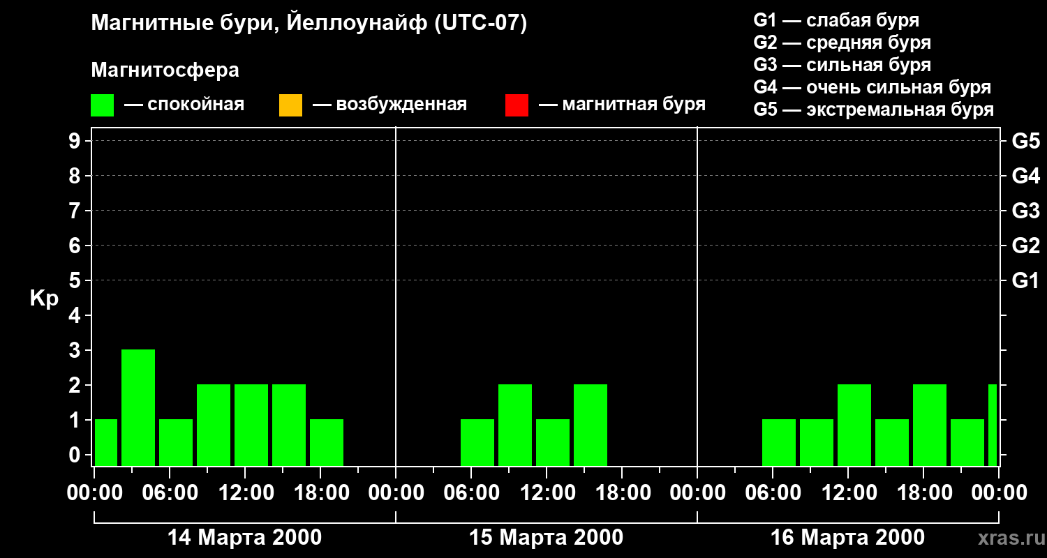Изменения геомагнитного индекса Kp с 14 по 16 марта 2000 года для средних широт