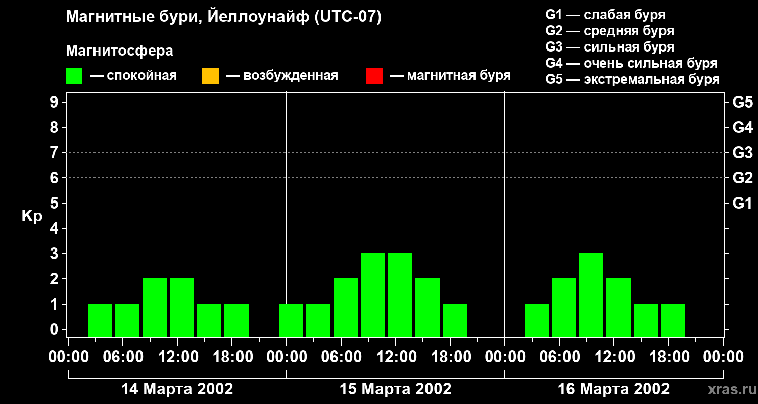 Изменения геомагнитного индекса Kp с 14 по 16 марта 2002 года для средних широт