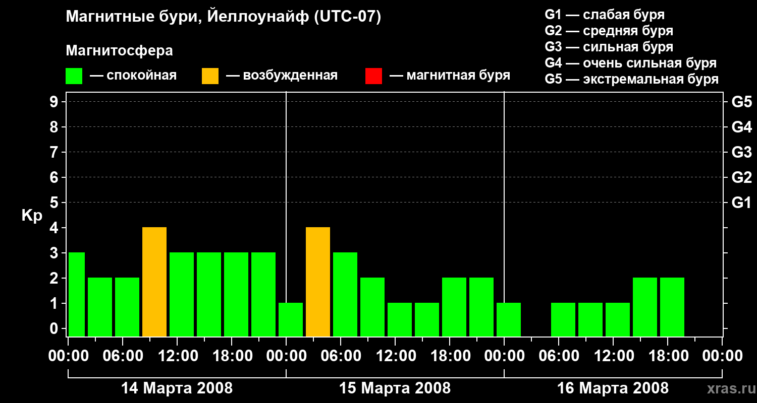 Изменения геомагнитного индекса Kp с 14 по 16 марта 2008 года для средних широт