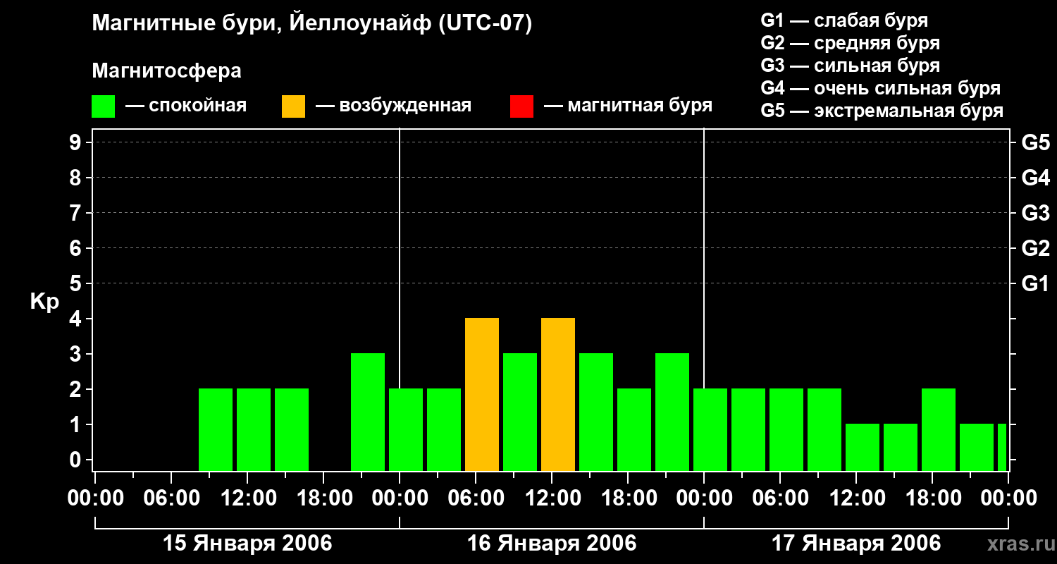 Изменения геомагнитного индекса Kp с 15 по 17 января 2006 года для средних широт