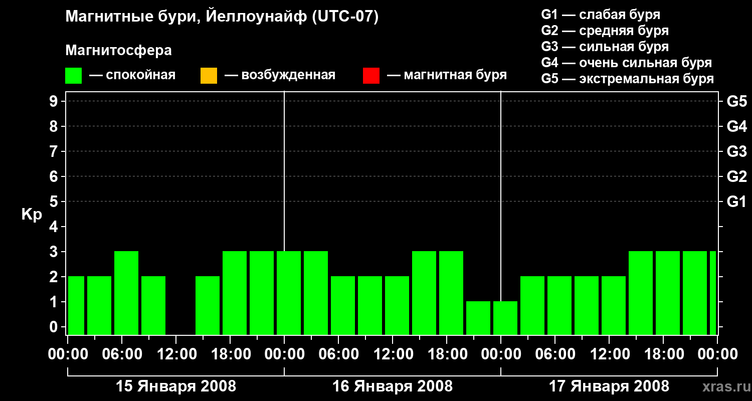 Изменения геомагнитного индекса Kp с 15 по 17 января 2008 года для средних широт