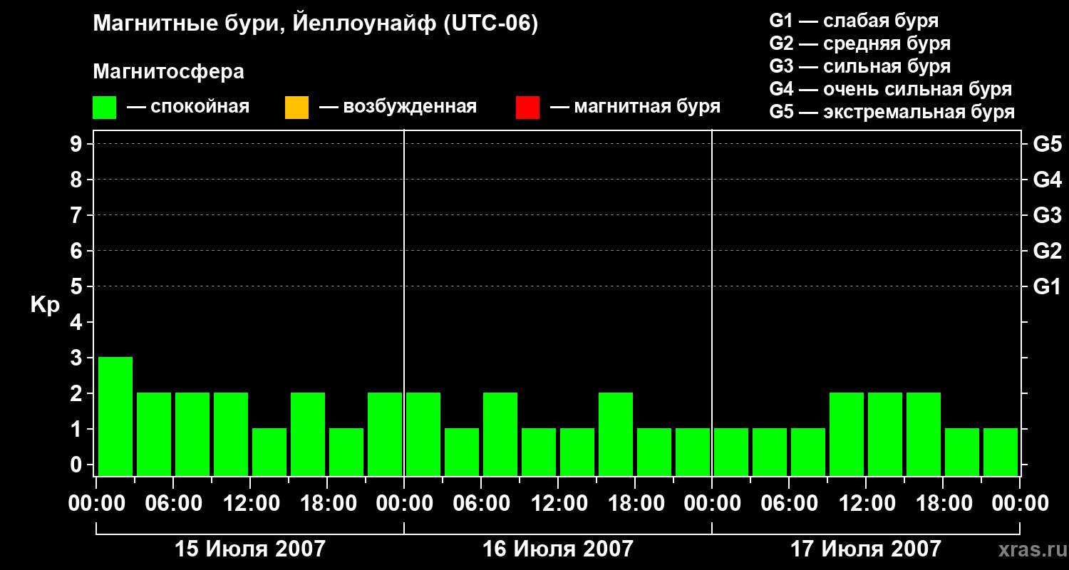 Изменения геомагнитного индекса Kp с 15 по 17 июля 2007 года для средних широт