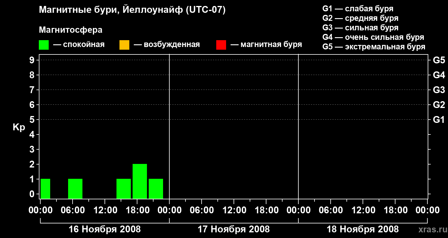 Изменения геомагнитного индекса Kp с 16 по 18 ноября 2008 года для средних широт