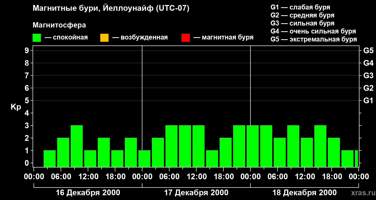 Изменения геомагнитного индекса Kp с 16 по 18 декабря 2000 года для средних широт