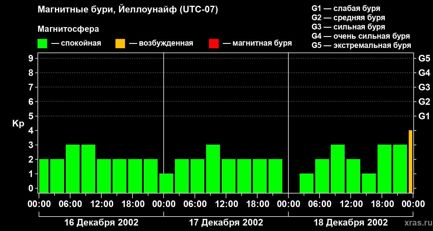 Изменения геомагнитного индекса Kp с 16 по 18 декабря 2002 года для средних широт