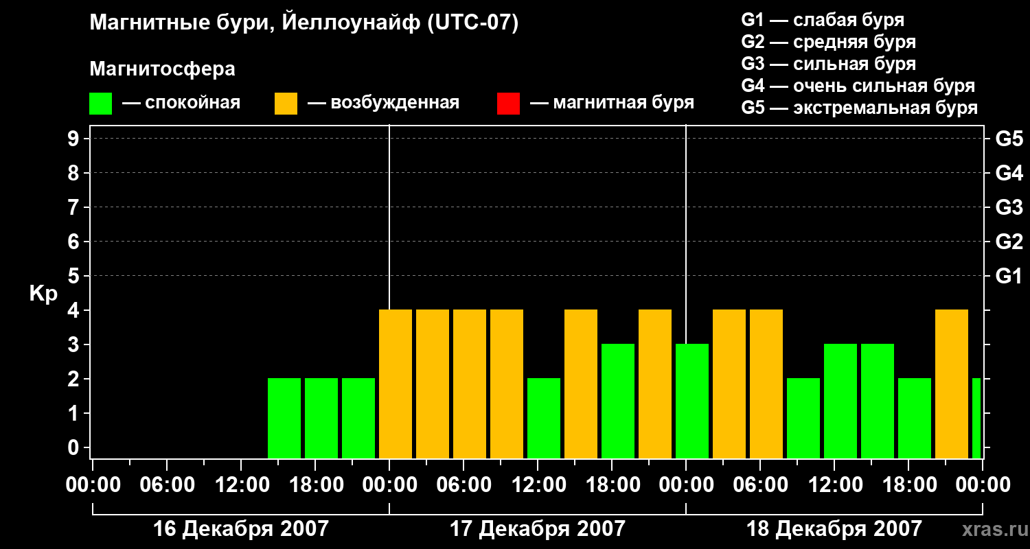 Изменения геомагнитного индекса Kp с 16 по 18 декабря 2007 года для средних широт