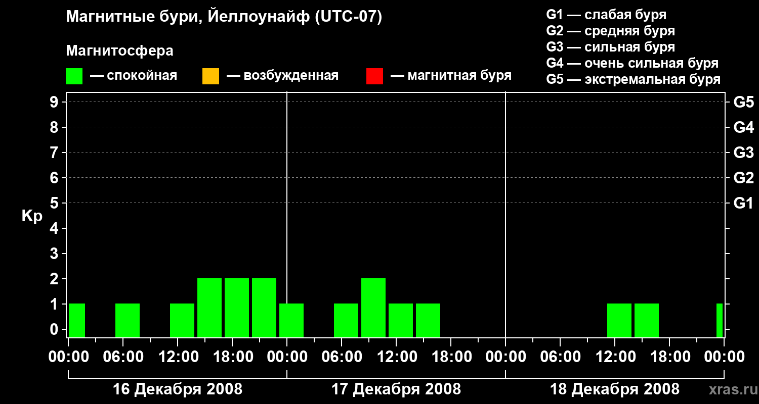 Изменения геомагнитного индекса Kp с 16 по 18 декабря 2008 года для средних широт
