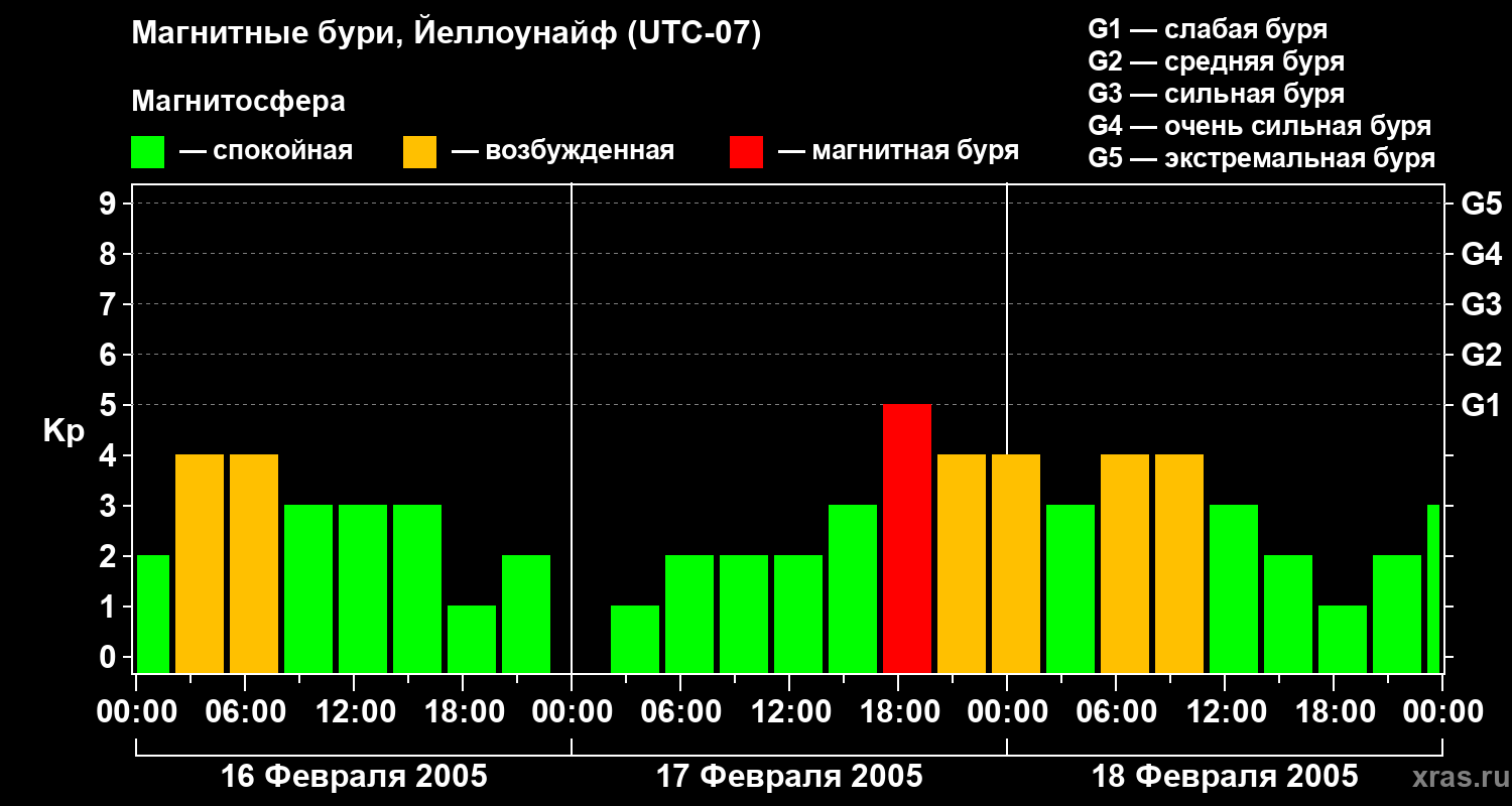 Изменения геомагнитного индекса Kp с 16 по 18 февраля 2005 года для средних широт