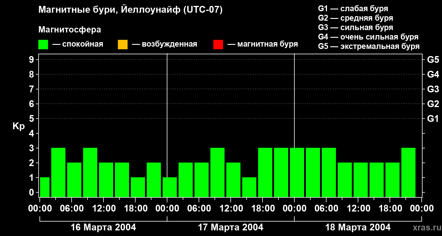 Изменения геомагнитного индекса Kp с 16 по 18 марта 2004 года для средних широт