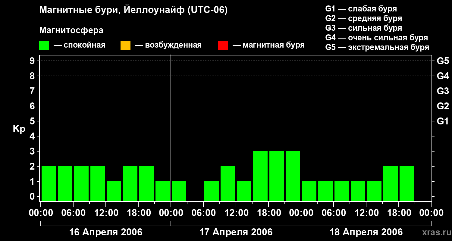 Изменения геомагнитного индекса Kp с 16 по 18 апреля 2006 года для средних широт