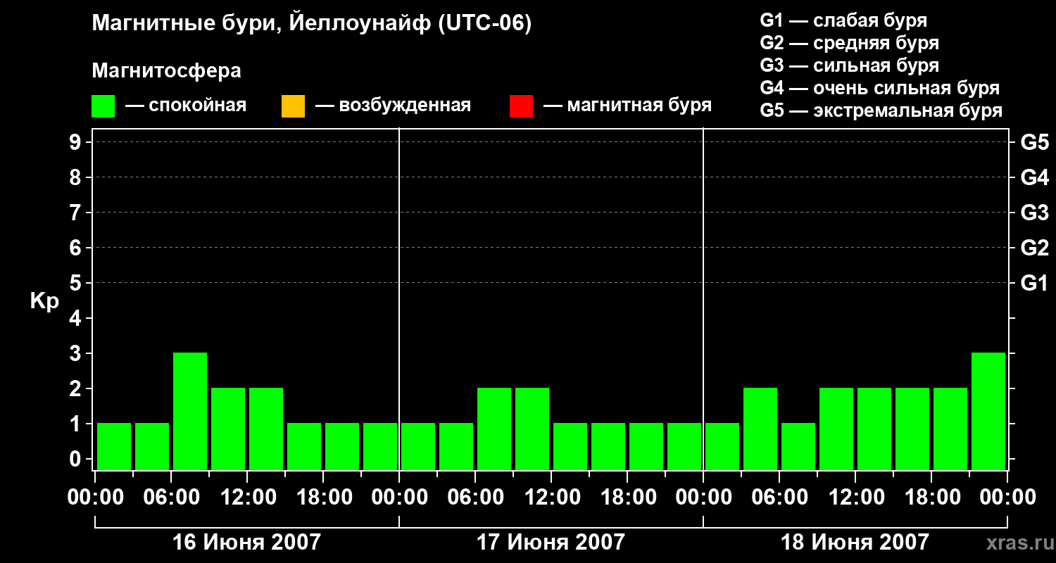 Изменения геомагнитного индекса Kp с 16 по 18 июня 2007 года для средних широт