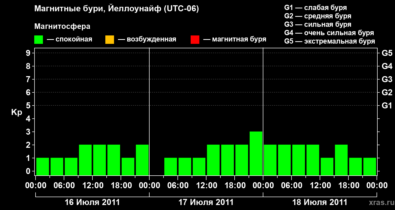 Изменения геомагнитного индекса Kp с 16 по 18 июля 2011 года для средних широт
