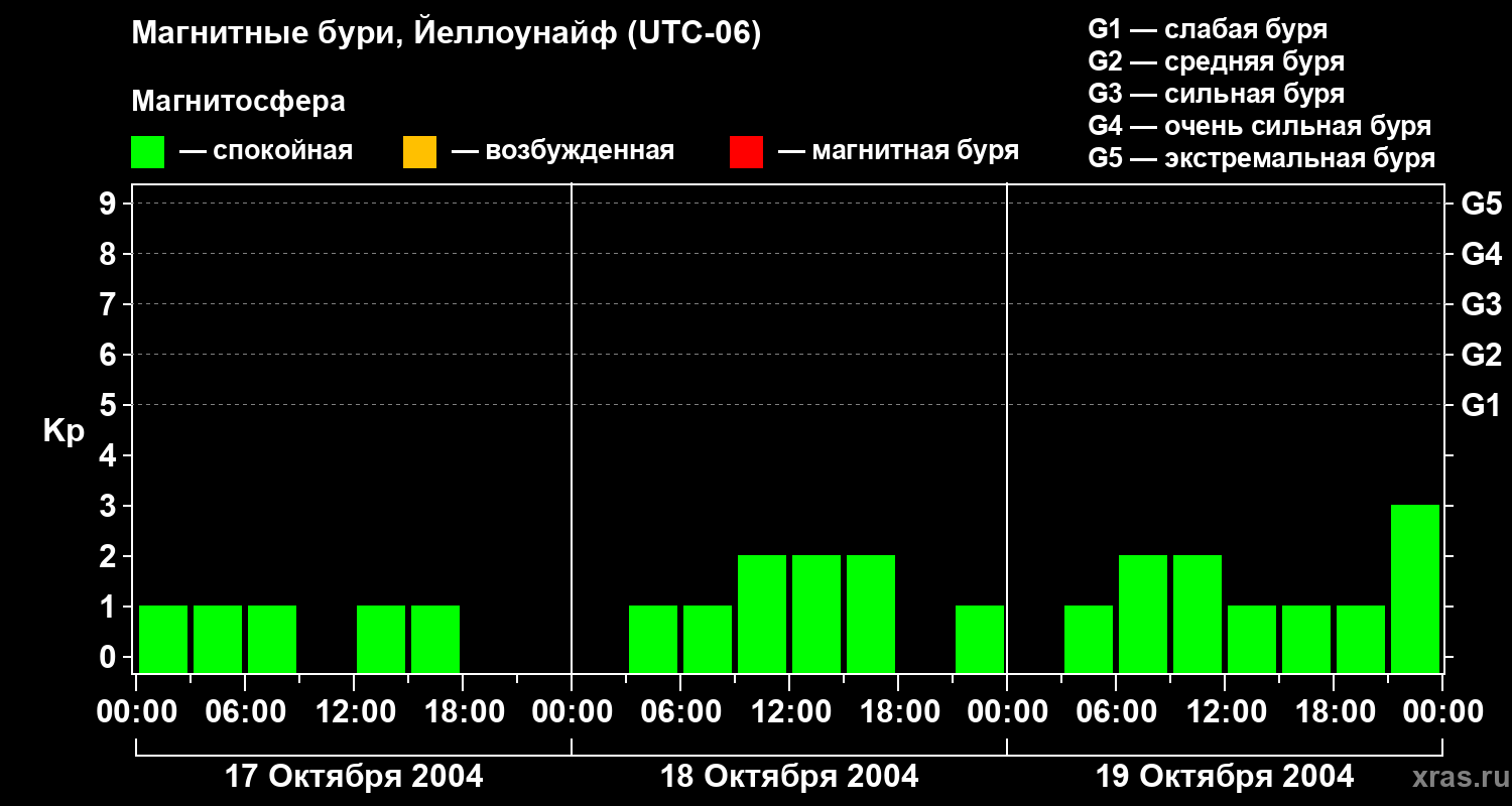 Изменения геомагнитного индекса Kp с 17 по 19 октября 2004 года для средних широт