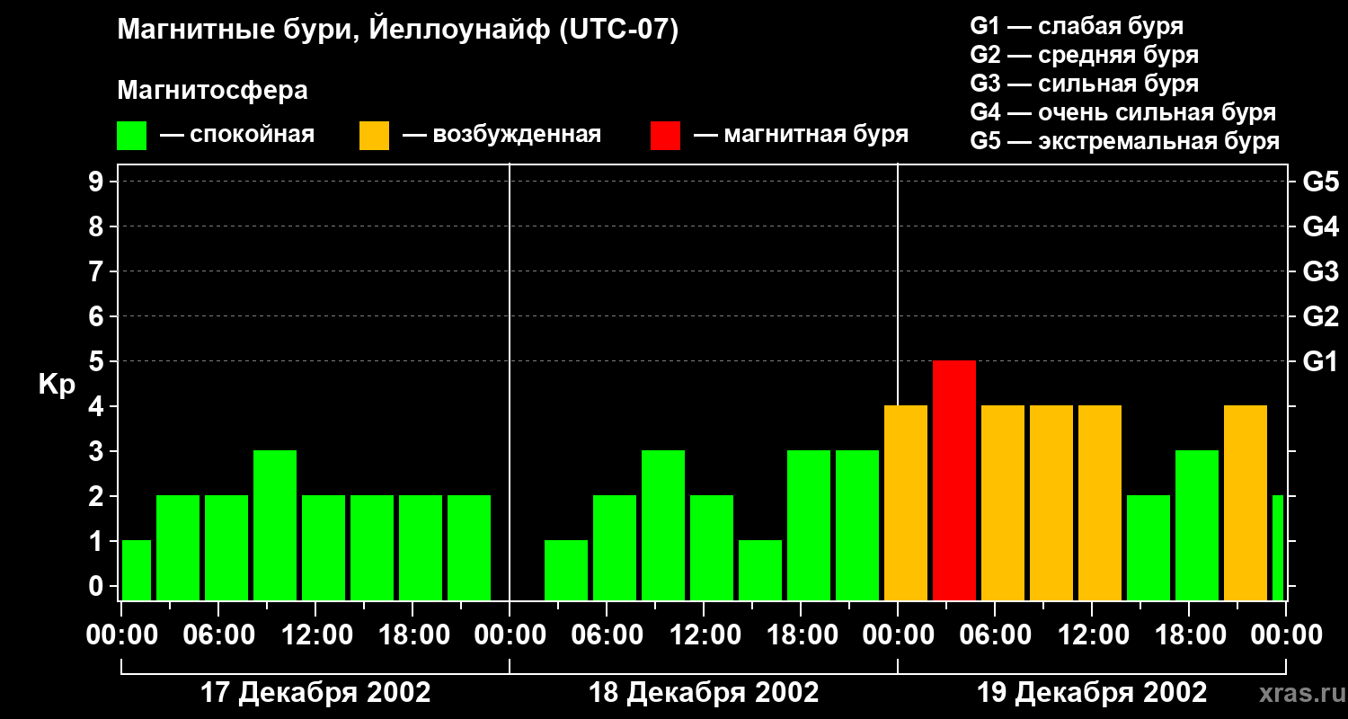 Изменения геомагнитного индекса Kp с 17 по 19 декабря 2002 года для средних широт