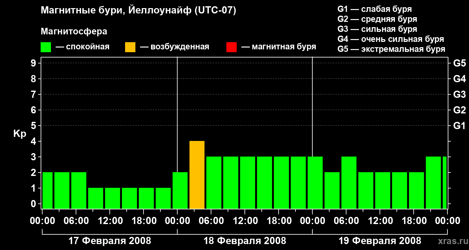 Изменения геомагнитного индекса Kp с 17 по 19 февраля 2008 года для средних широт