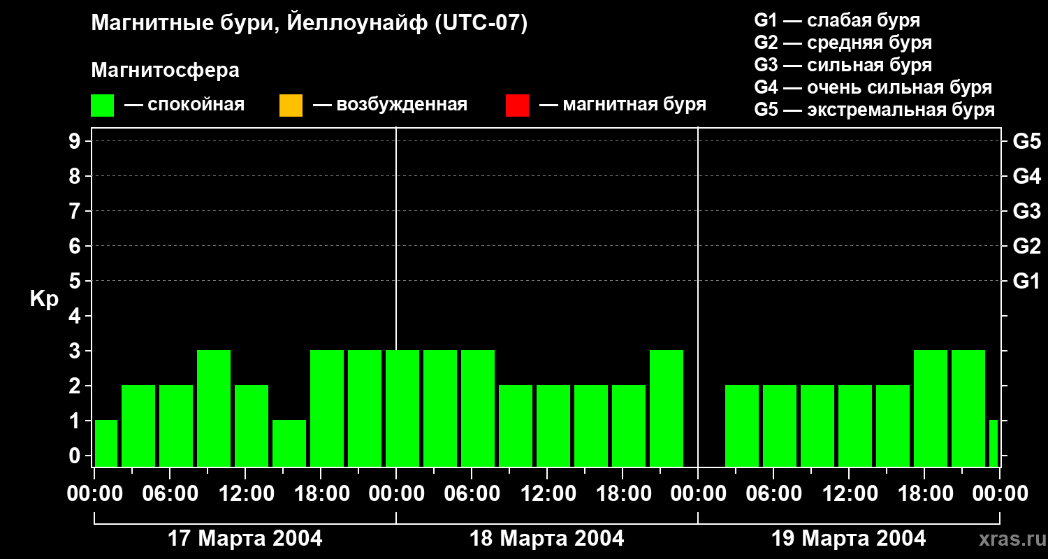 Изменения геомагнитного индекса Kp с 17 по 19 марта 2004 года для средних широт