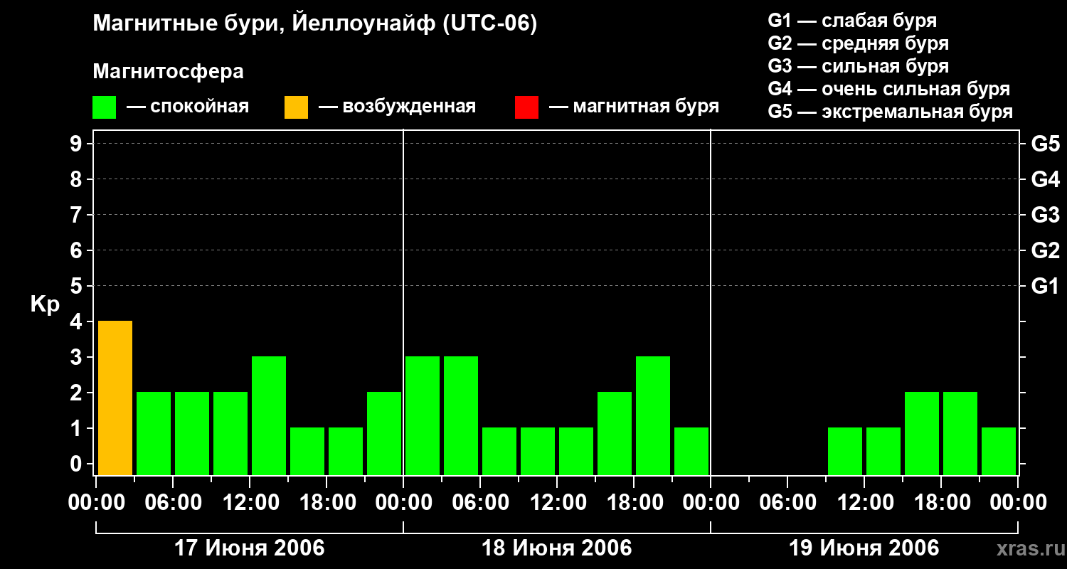 Изменения геомагнитного индекса Kp с 17 по 19 июня 2006 года для средних широт
