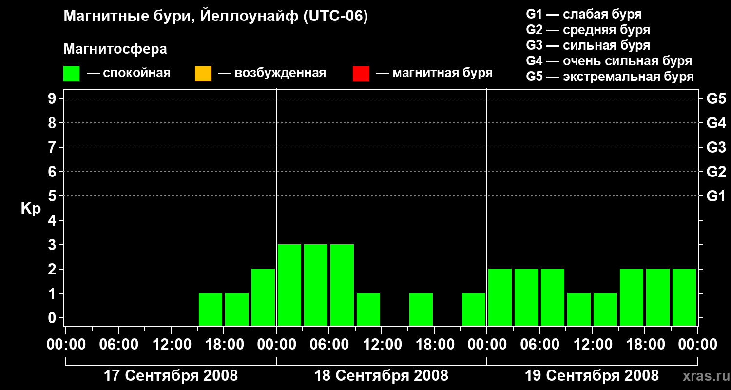 Изменения геомагнитного индекса Kp с 17 по 19 сентября 2008 года для средних широт