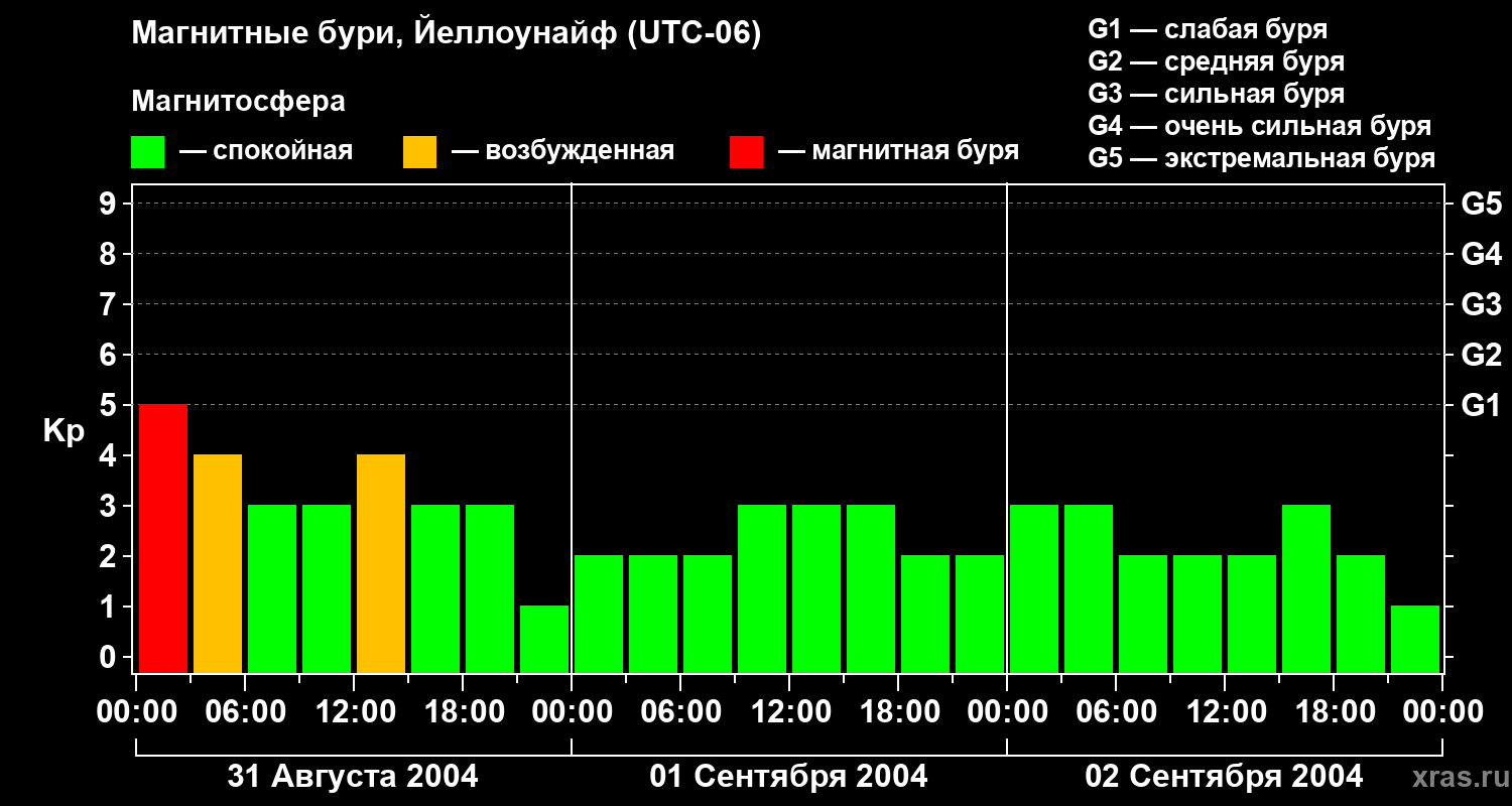 Изменения геомагнитного индекса Kp с 31 августа по 2 сентября 2004 года для средних широт