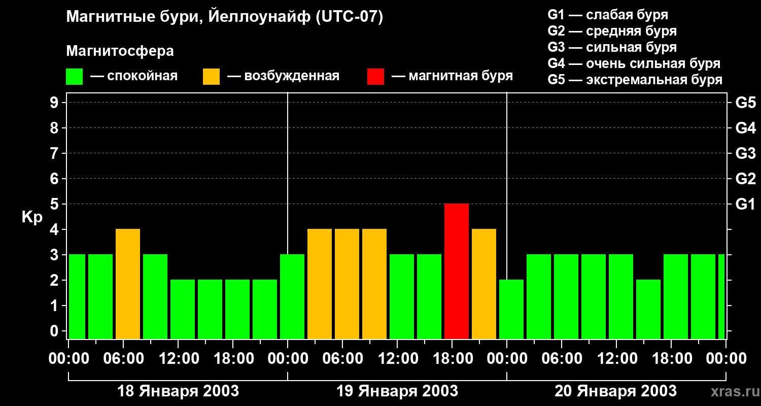 Изменения геомагнитного индекса Kp с 18 по 20 января 2003 года для средних широт