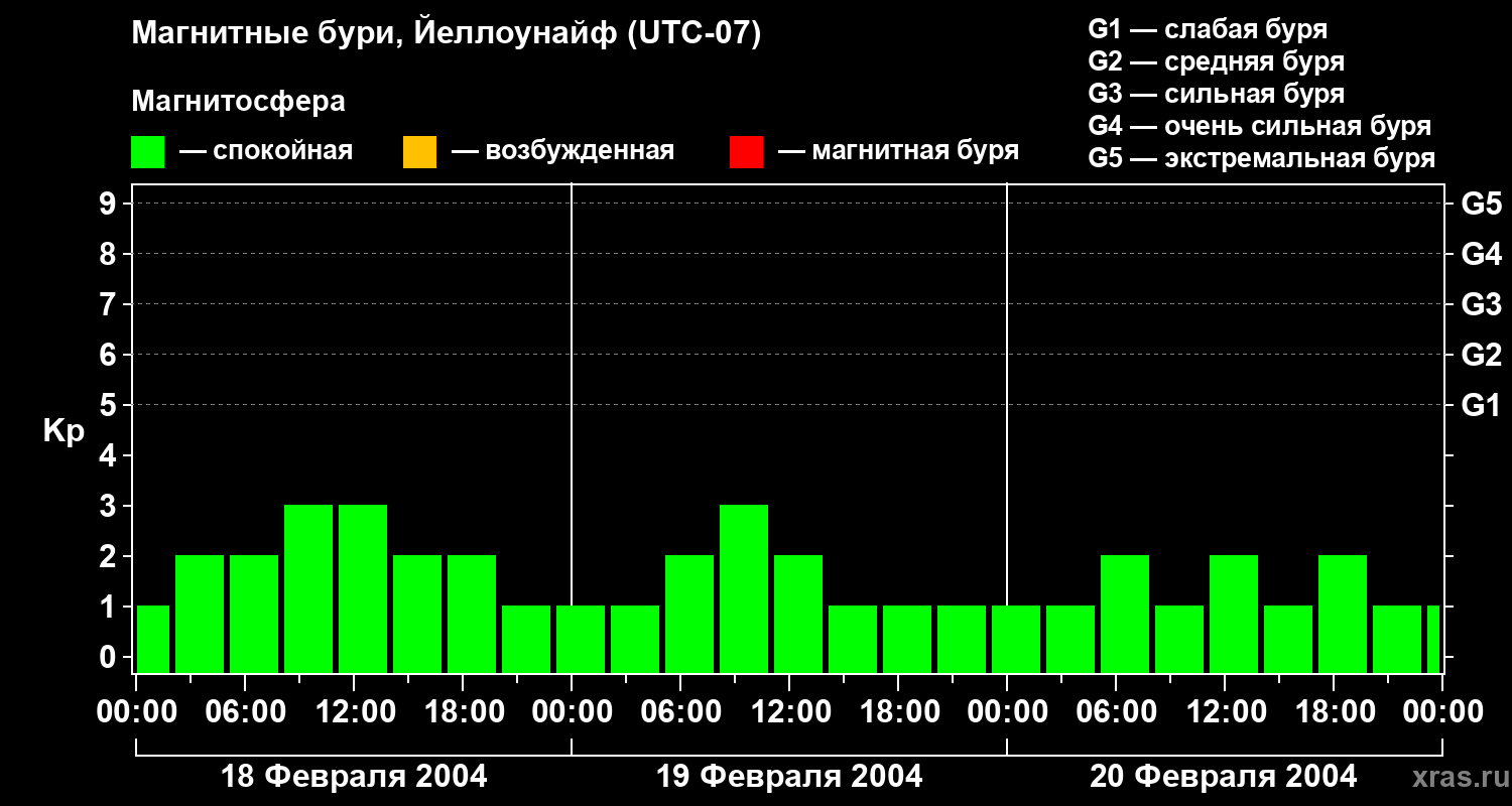 Изменения геомагнитного индекса Kp с 18 по 20 февраля 2004 года для средних широт