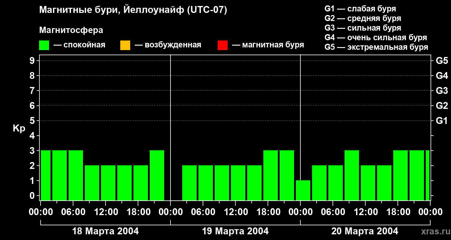 Изменения геомагнитного индекса Kp с 18 по 20 марта 2004 года для средних широт
