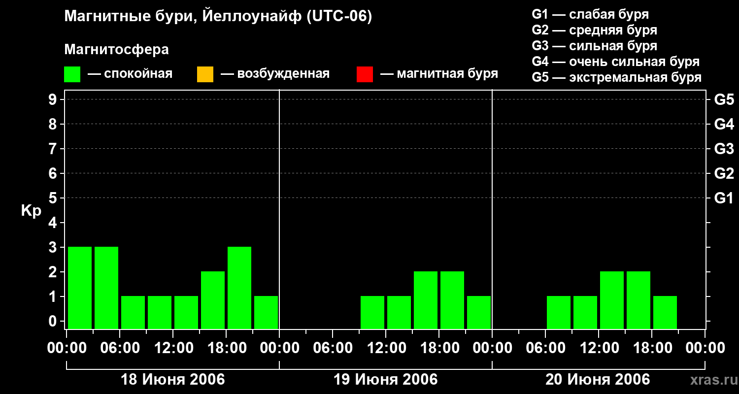 Изменения геомагнитного индекса Kp с 18 по 20 июня 2006 года для средних широт